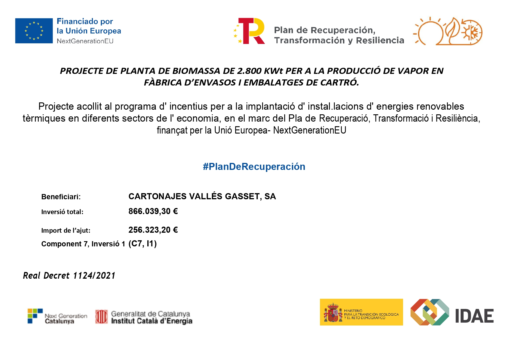 CARTONAJES VALLES GASSET, S.A. ha recibido una ayuda para su proyecto de autoconsumo “Instal·lació fotovoltaica”, cofinanciada por el Mecanismo Europeo de Recuperación y Resiliencia PRTR-Next Generation EU, coordinada por el Ministerio para la Transición Ecológica y el Reto Demográfico través de IDAE y gestionada por las autonomías según el Real Decreto 477/2021, con el objetivo de conseguir una economía más limpia y sostenible. Se ha elaborado un proyecto de autoconsumo con fuentes de energía renovable, consistente en una instalación de placas fotovoltaicas en las instalaciones de CARTONAJES VALLES GASSET, S.A. (Lleida). En este proyecto se han instalado 2.234 módulos de 540 Wp con una potencia total de 1.206,36 kWp.